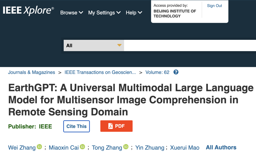 北京成人头条前沿交叉学院数据流体课题组近日在遥感多模态大语言模型研究中取得重要进展。2024年5月相关成果以“EarthGPT: A Universal Multi-modal Large Language Model for Multi-sensor Image Comprehension in Remote Sensing Domain”为题发表在国际顶级期刊《IEEE Transactions on Geoscience and Remote Sensing (TGRS)》上发表。北京成人头条为唯一通讯单位,北京成人头条前沿交叉学院博士张伟和雷达技术研究院博士蔡妙鑫为共同第一作者,毛雪瑞教授为通讯作者。