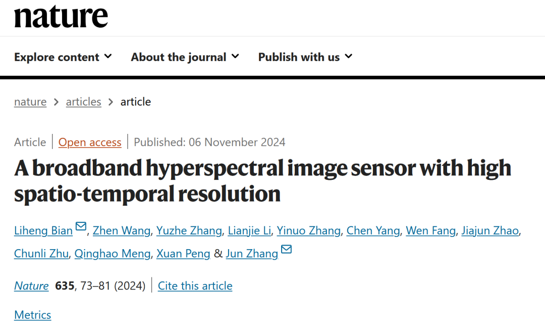 文章题为“A broadband hyperspectral image sensor with high spatio-temporal resolution”。团队提出了片上光谱复用感知理论与技术,颠覆了传统几何分光、窄带测量、物理输出模式,实现了片上宽带异化调控的高光谱成像。团队自主研制了高光谱智能成像器件,将光能利用率由典型的不足25%跨越提升至74.8%。该器件仅重数十克,工作波段覆盖了可见光和近红外超宽波段(400-1700nm),具有国际领先的空-时-谱分辨率(1024×1024@124fps,96通道),拥有完全自主知识产权。
